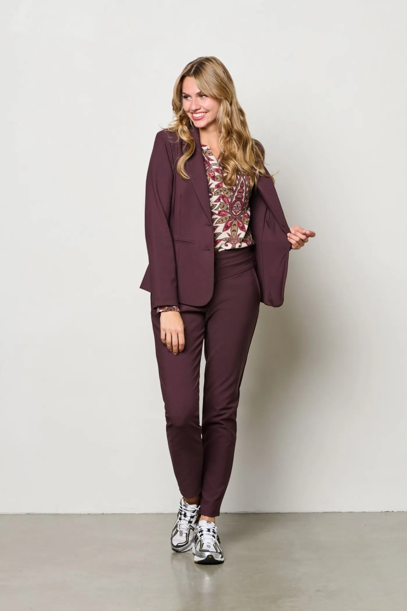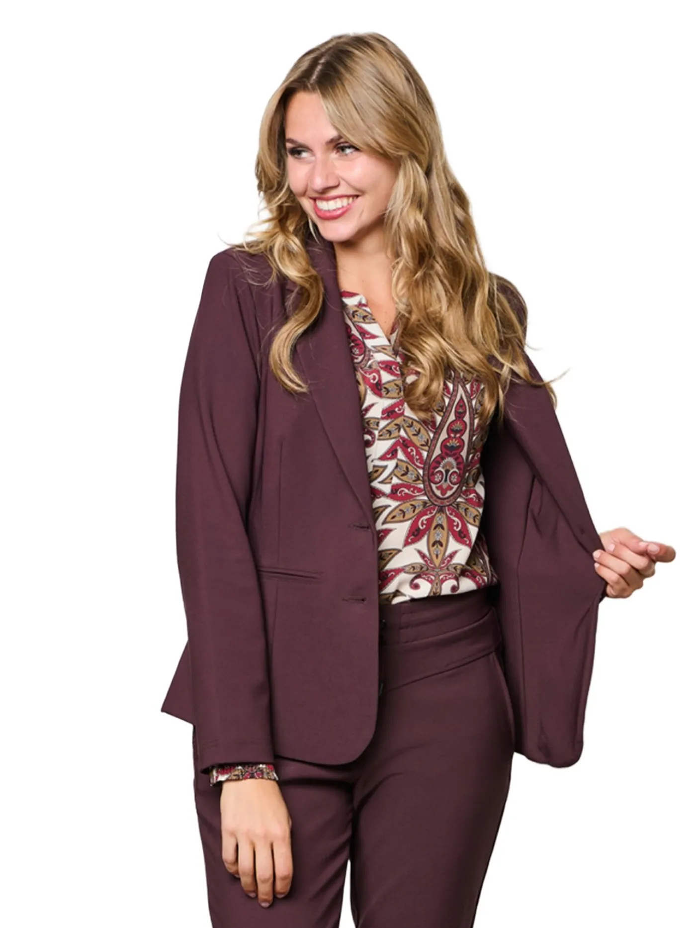 Deze auberinge kleurige blazer van &Co Woman is een elegante toevoeging aan je garderobe. Het strakke ontwerp en de hoogwaardige stof zorgen voor een perfecte pasvorm en een verfijnde uitstraling. Draag hem over een blouse voor een zakelijke look, of combineer met een top en jeans voor een stijlvolle casual outfit. De diepe bordeauxkleur geeft iedere outfit een chique en moderne touch. Een veelzijdig item dat je keer op keer kunt dragen.
