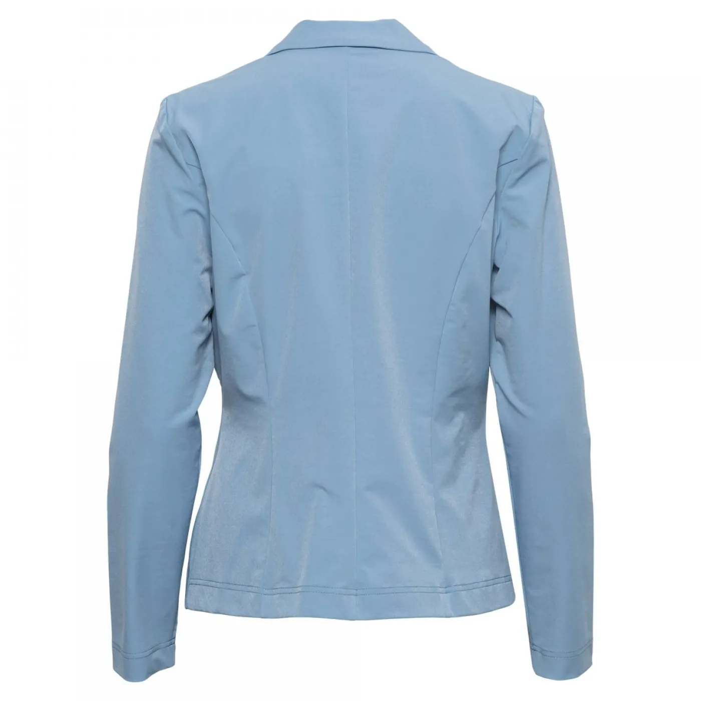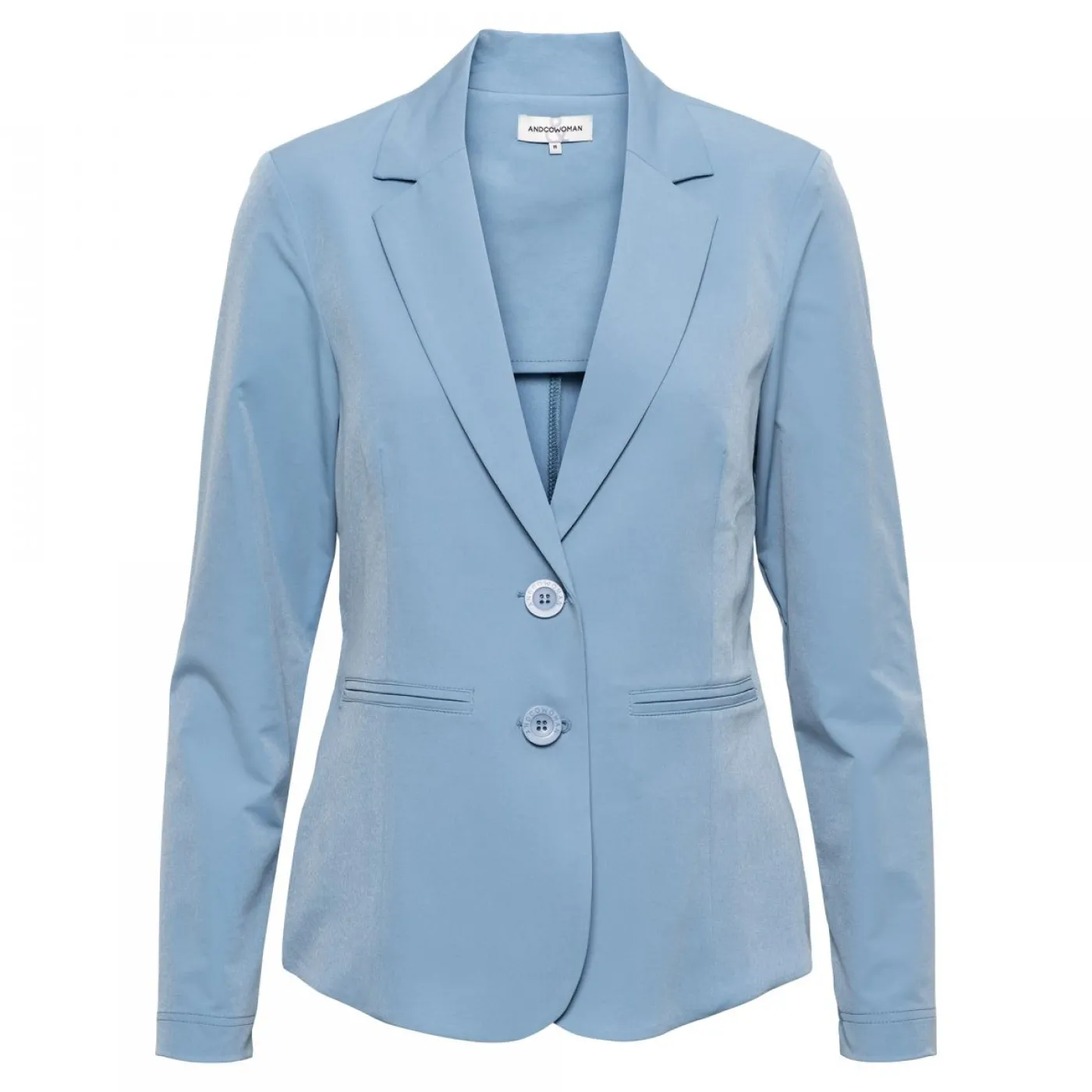 Deze lichtblauwe blazer van &CO WOMAN combineert een frisse kleur met een stijlvolle en moderne uitstraling. Het model is voorzien van een klassieke kraag en sluit met twee ton-sur-ton knopen aan de voorkant. De blazer heeft een licht getailleerde pasvorm die mooi aansluit op het lichaam en zorgt voor een elegante look. De fijne stof draagt comfortabel en voelt soepel aan. Met subtiele siernaden en nette paspelzakken is dit jasje zowel geschikt voor een zakelijke outfit als voor een meer casual combinatie.