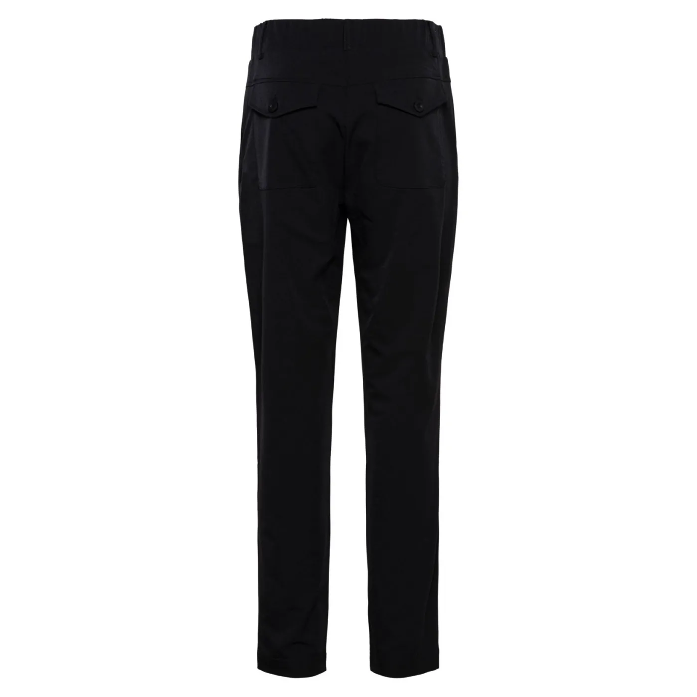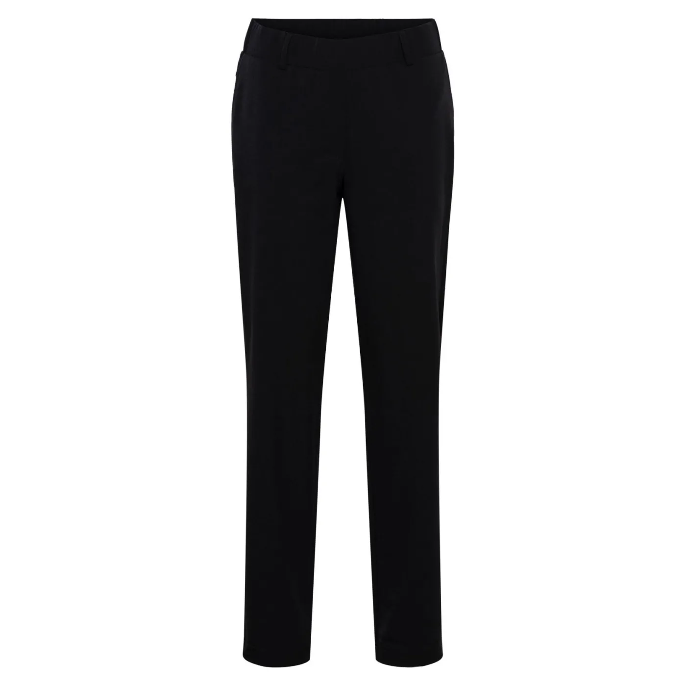 Zwarte Straight fit travel kwaliteit broek van het merk &Co Woman. Dit model heeft een gladde tailleband met riemlussen en twee steekzakken aan de voorzijde. Aan de achterzijde heeft dit model ook twee steekzakken met klep- en knoopsluiting.