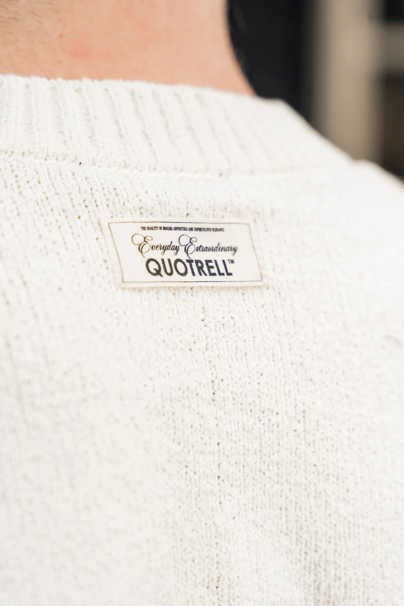 Deze gebroken witte sweater van Quotrell voor heren is stijlvol, warm en comfortabel. Het gebreide design geeft de trui een luxe uitstraling, terwijl het groene logo op de linker heup zorgt voor een subtiel maar opvallend detail dat zowel van de voor- als achterkant zichtbaar is. De sweater heeft een fijne pasvorm en is perfect voor een nette, casual look.