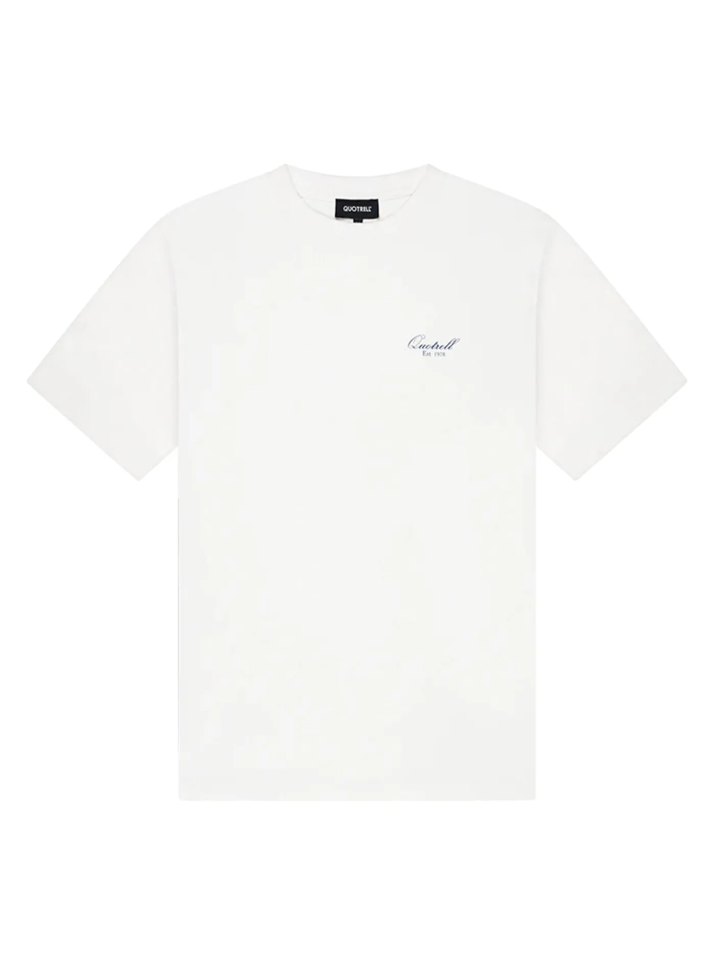 Wit oversized T-Shirt van het merk Quotrell. Dit model heeft een ronde halslijn en korte mouwen. Aan de voorzijde staat een blauw merklogo en op de rug een artwork.