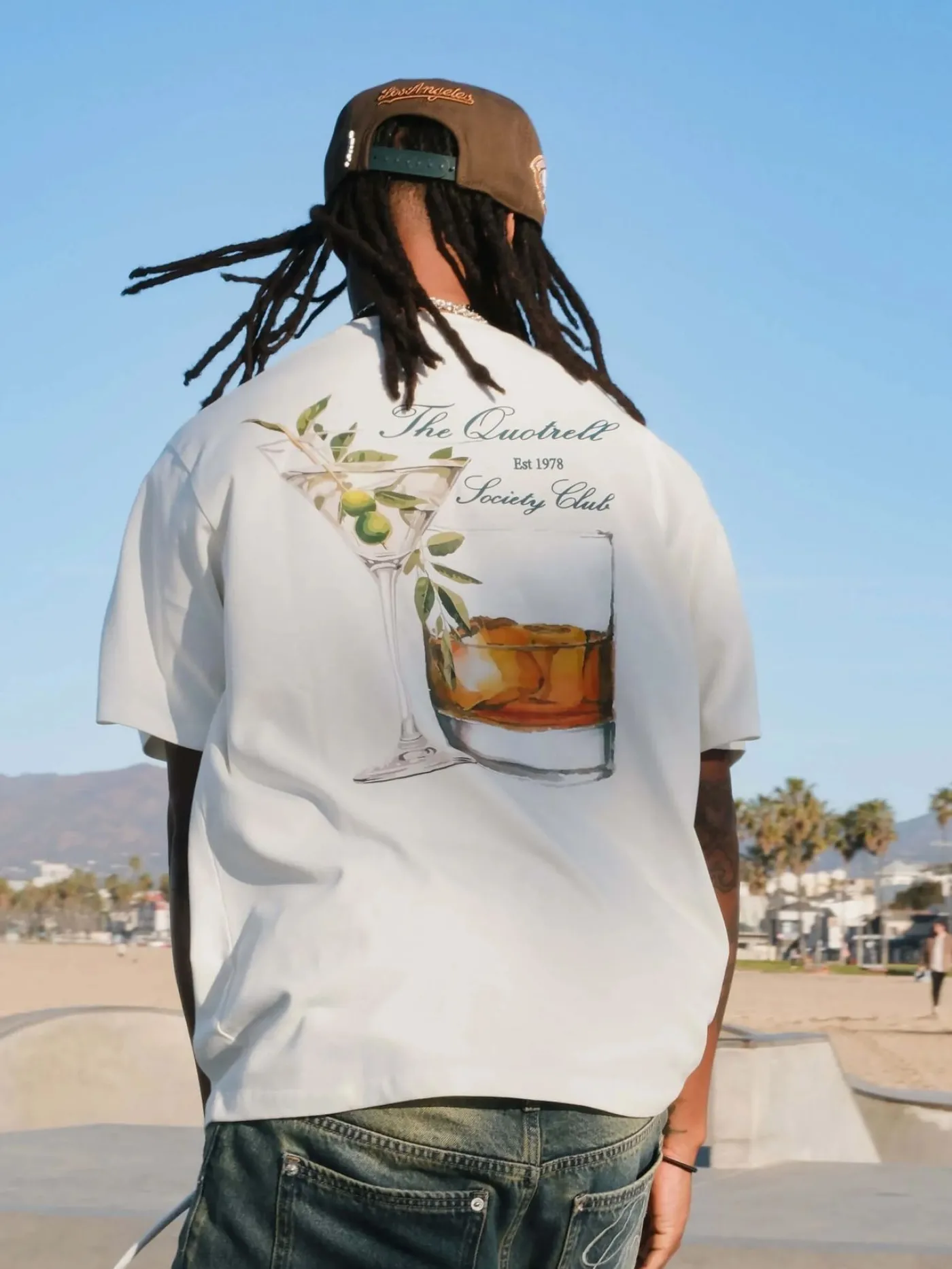 Wit T-Shirt voor heren van het merk Quotrell. Het item is gemaakt van 100% katoen. Hij heeft een ronde hals, korte mouwen en een oversized pasvorm voor ultiem comfort. De 2 drankjes op de achterkant geven een trendy touch.