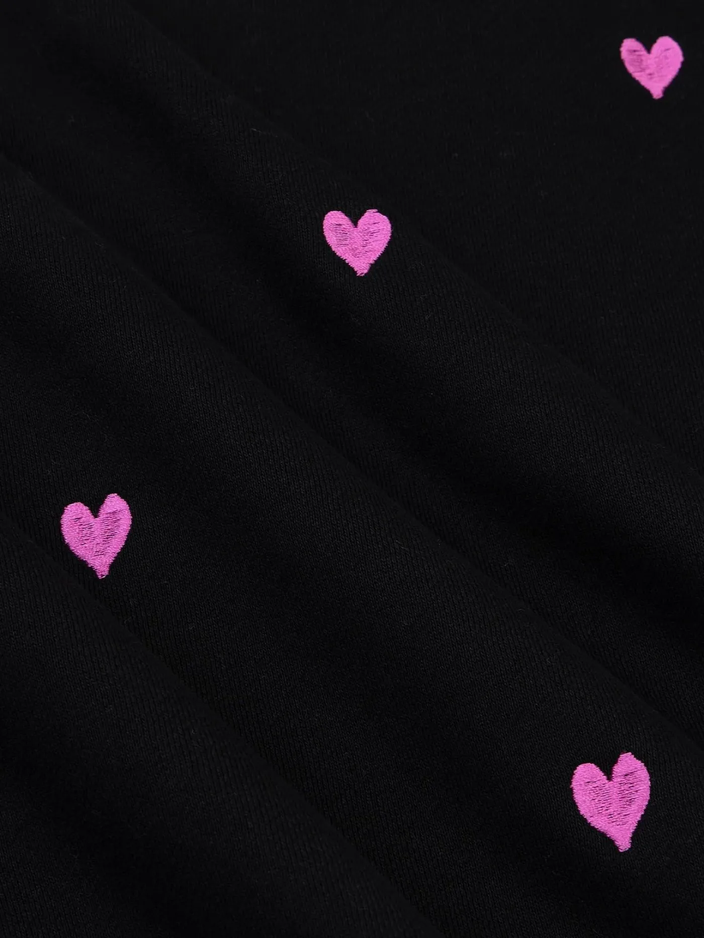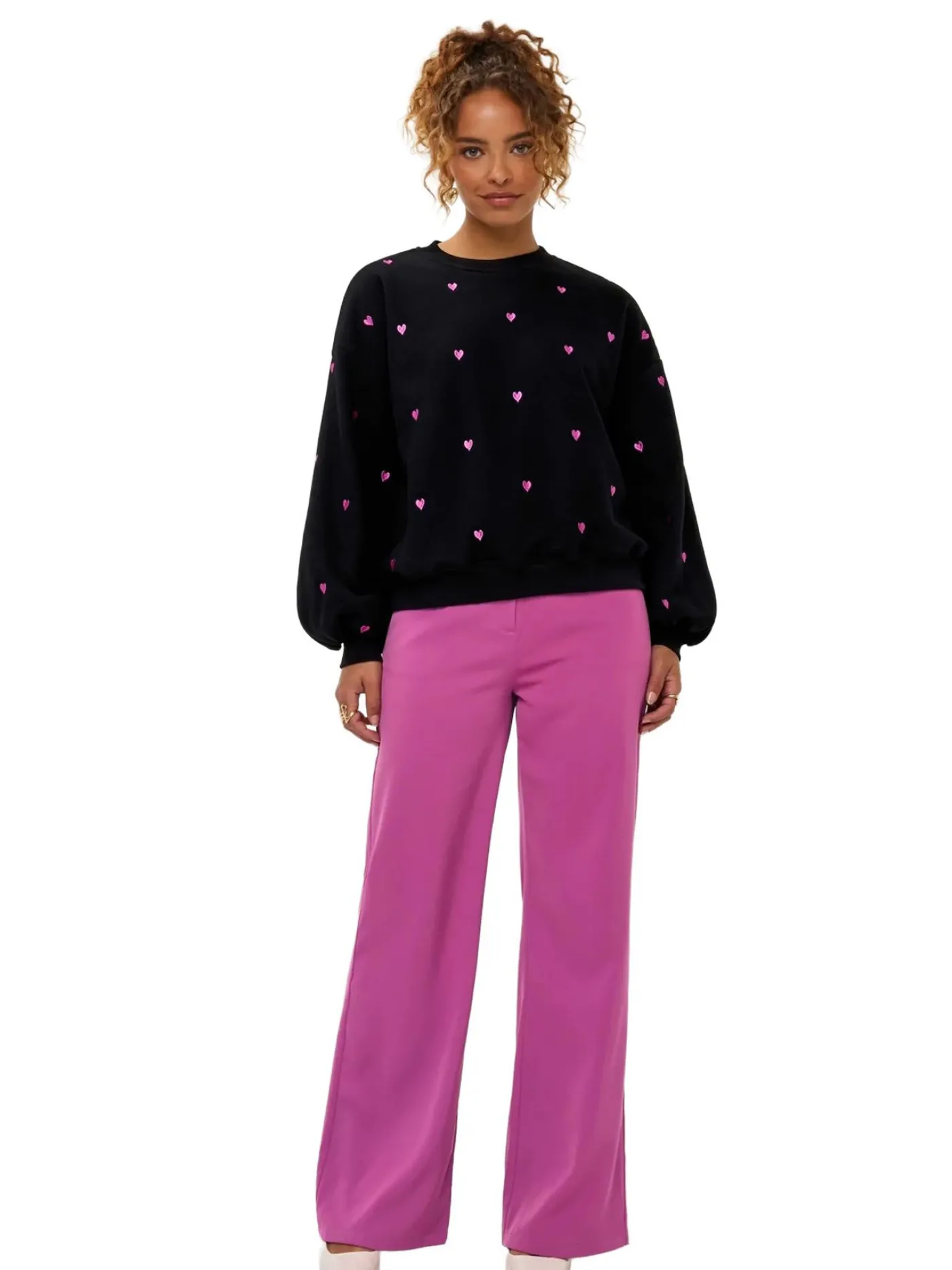 Deze zwarte sweater voor dames is heerlijk zacht en warm, ideaal voor de koudere dagen. De roze hartjes zorgen voor een vrolijke en vrouwelijke touch. Dankzij de regular fit en tijdloze kleur is de sweater makkelijk te combineren met allerlei jeans en broeken.