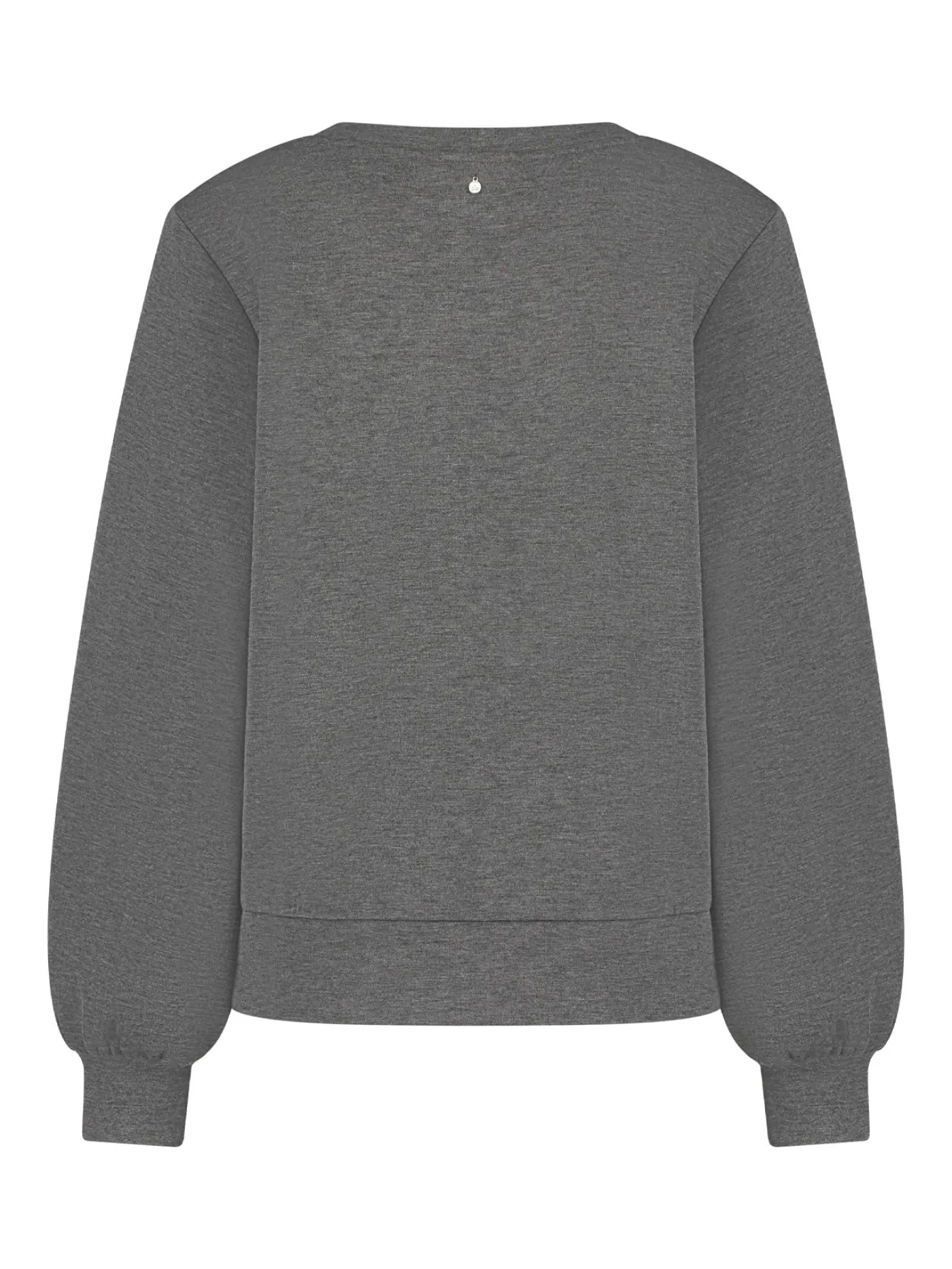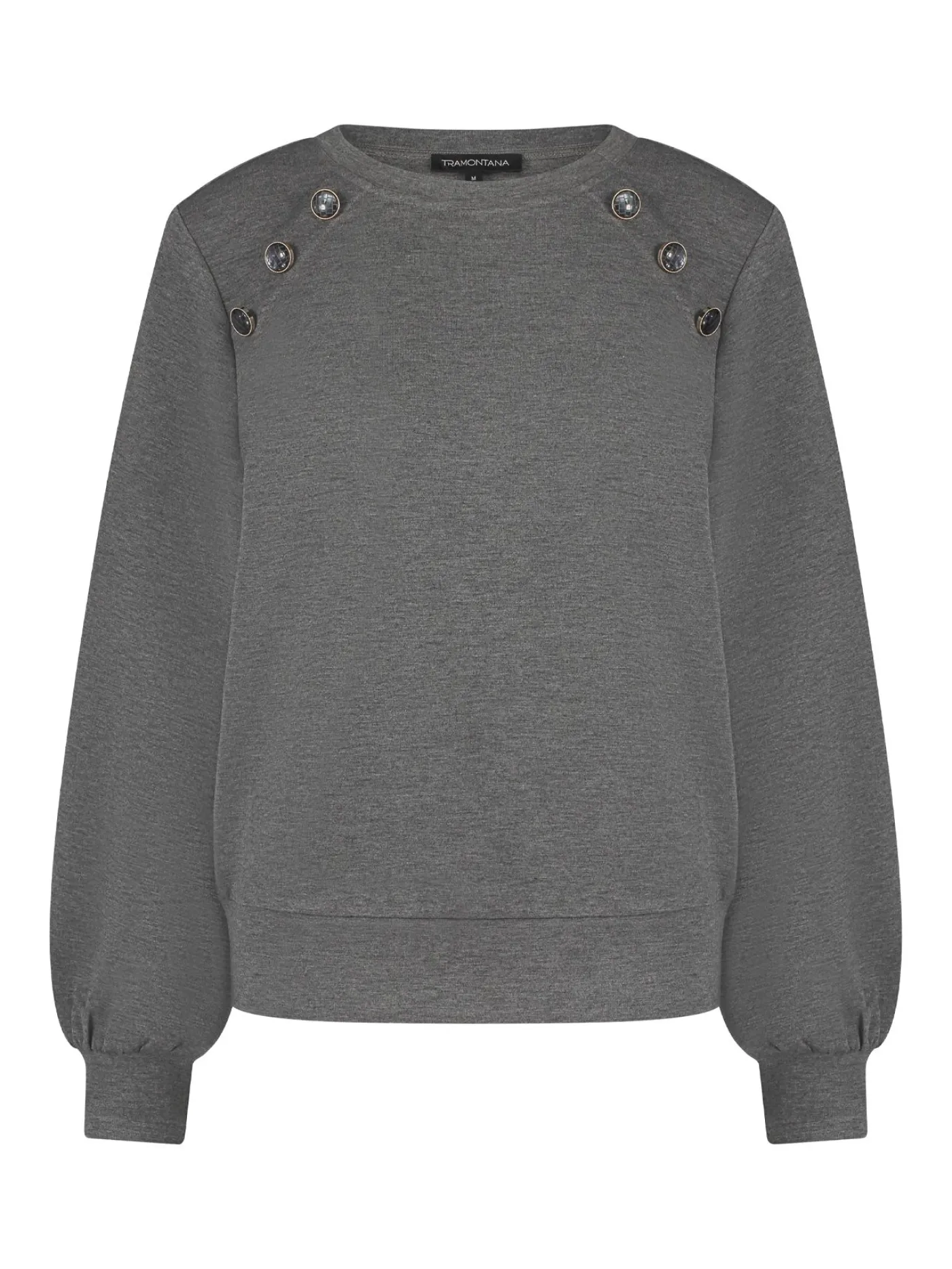 Grijze trui van Tramontana. De trui heeft knoopjes onder de schouder als detail. De mouwen zijn aan de onderkant een beetje gepoft en sluit weer aan bij de polsen.
