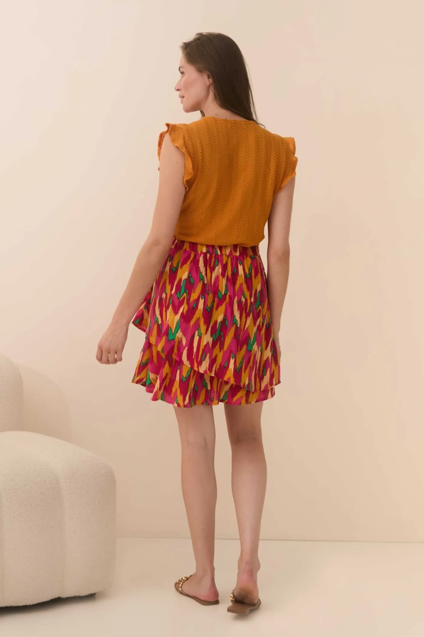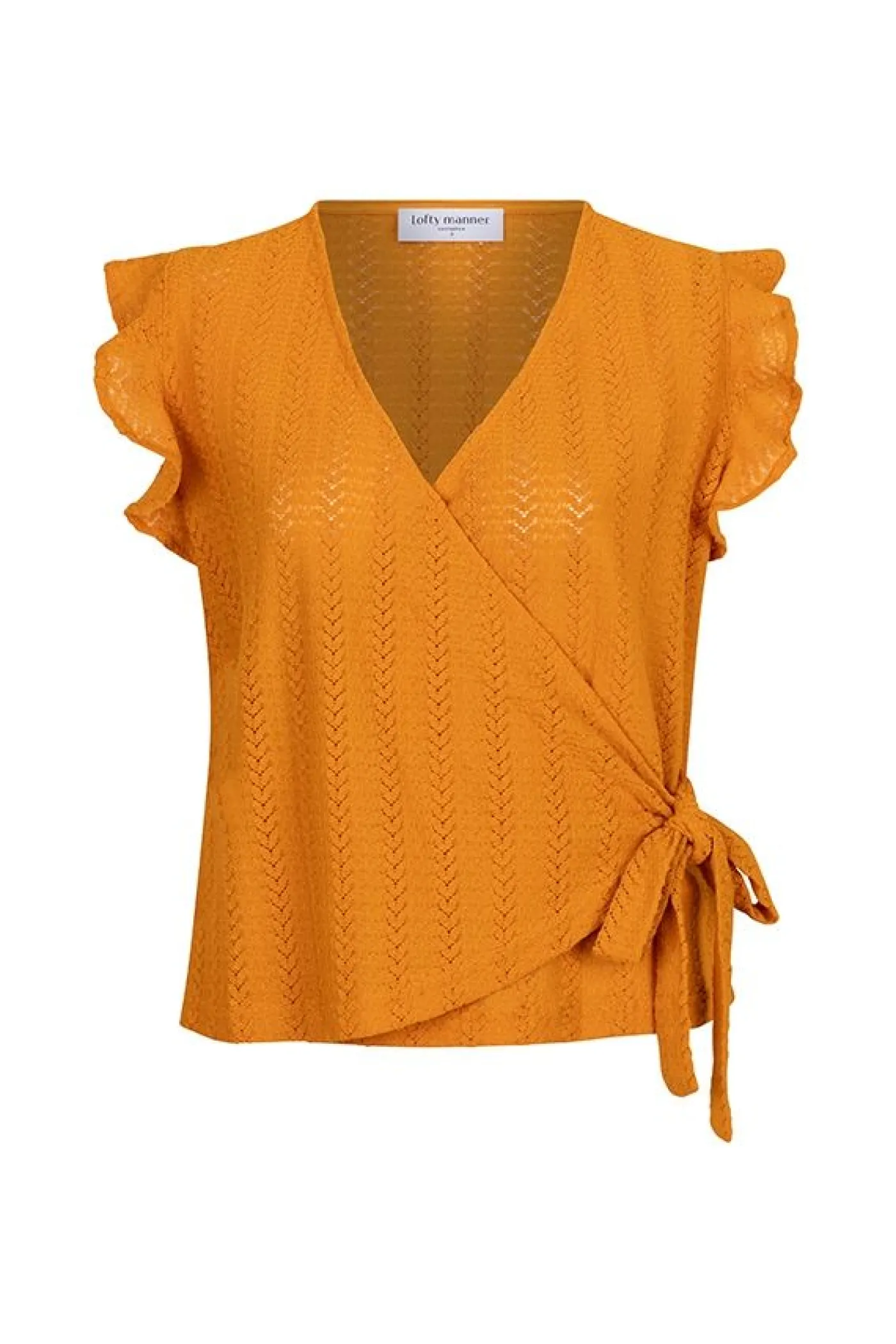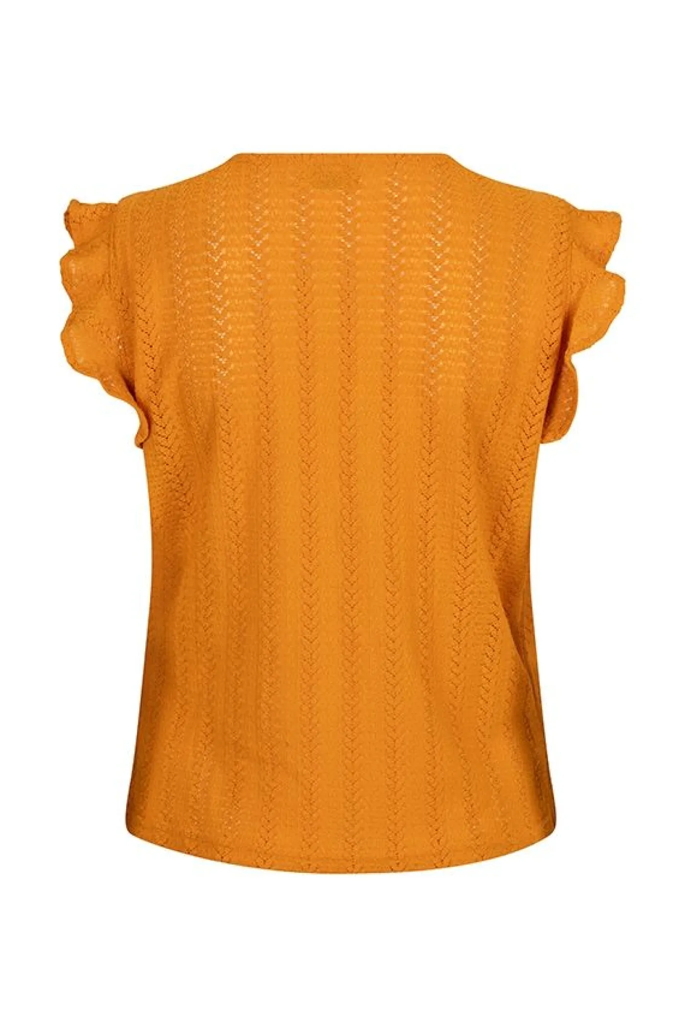 De effen oranje kleur maakt de top makkelijk te combineren met neutrale of complementaire kleuren.