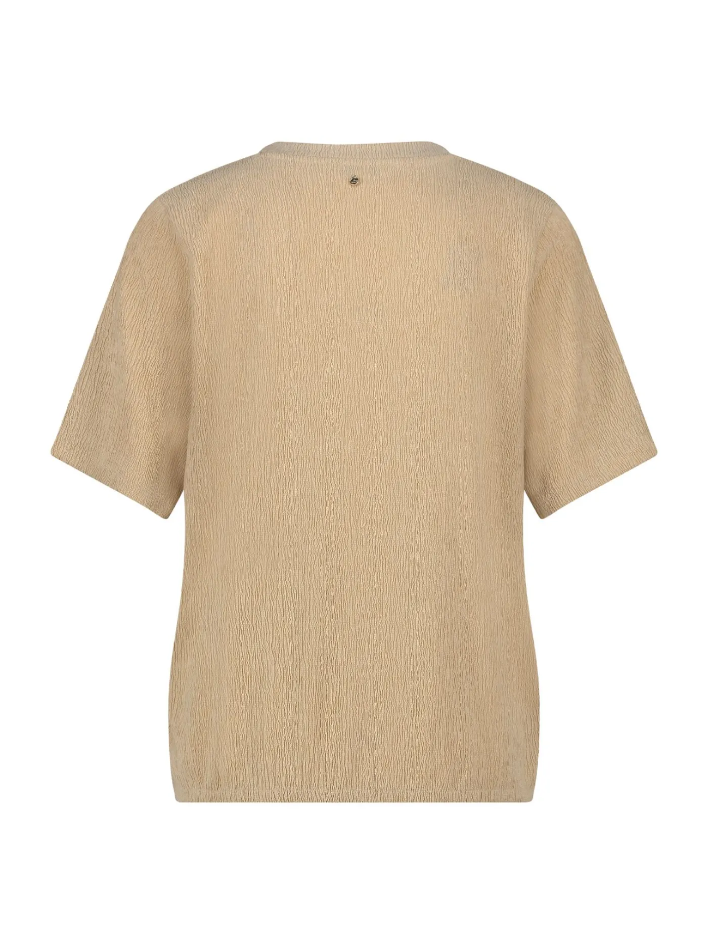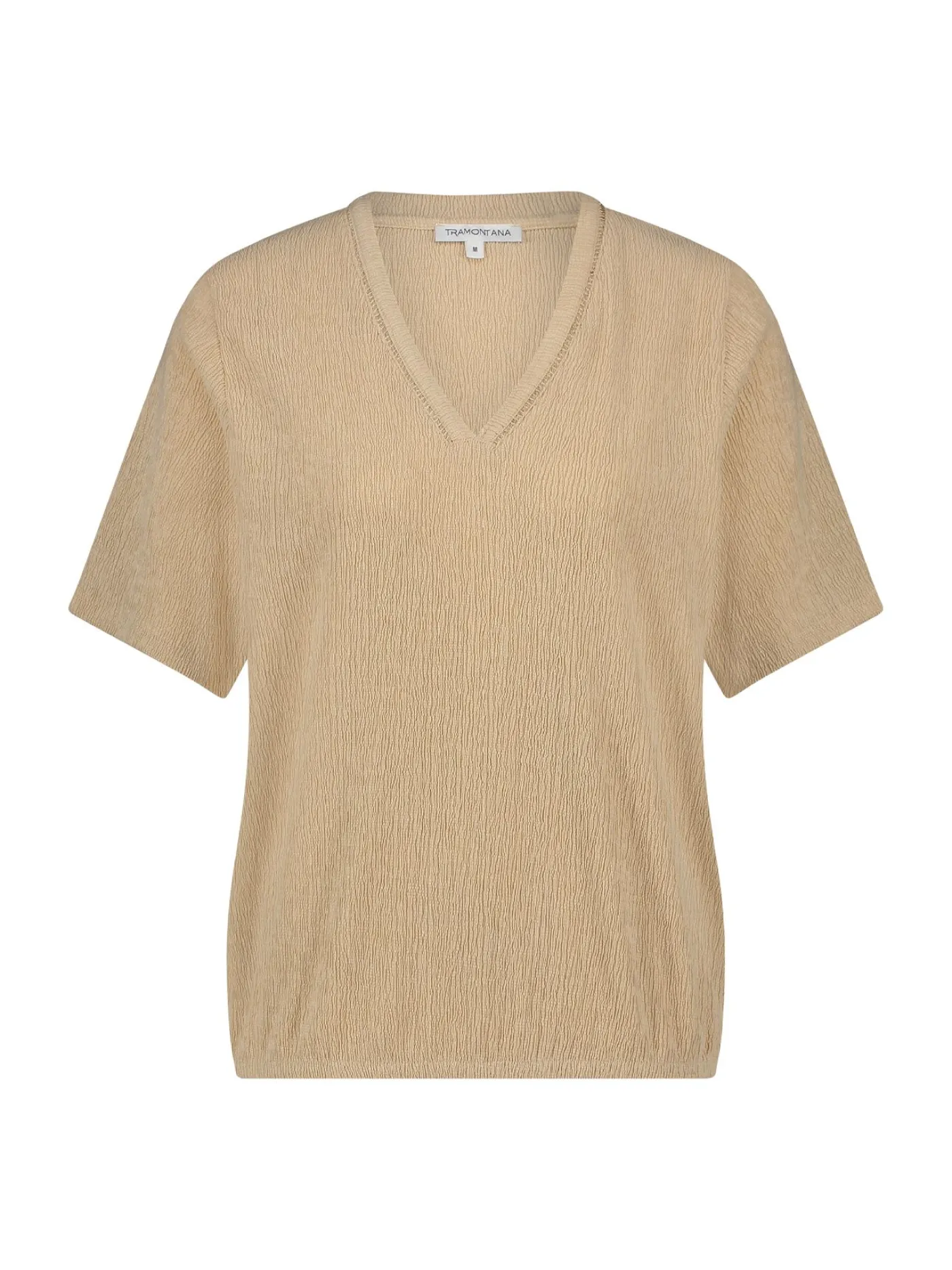 De Tramontana V-Neck Top in de kleur Sandis een verfijnde en veelzijdige top die moeiteloos in diverse outfits gecombineerd kan worden.