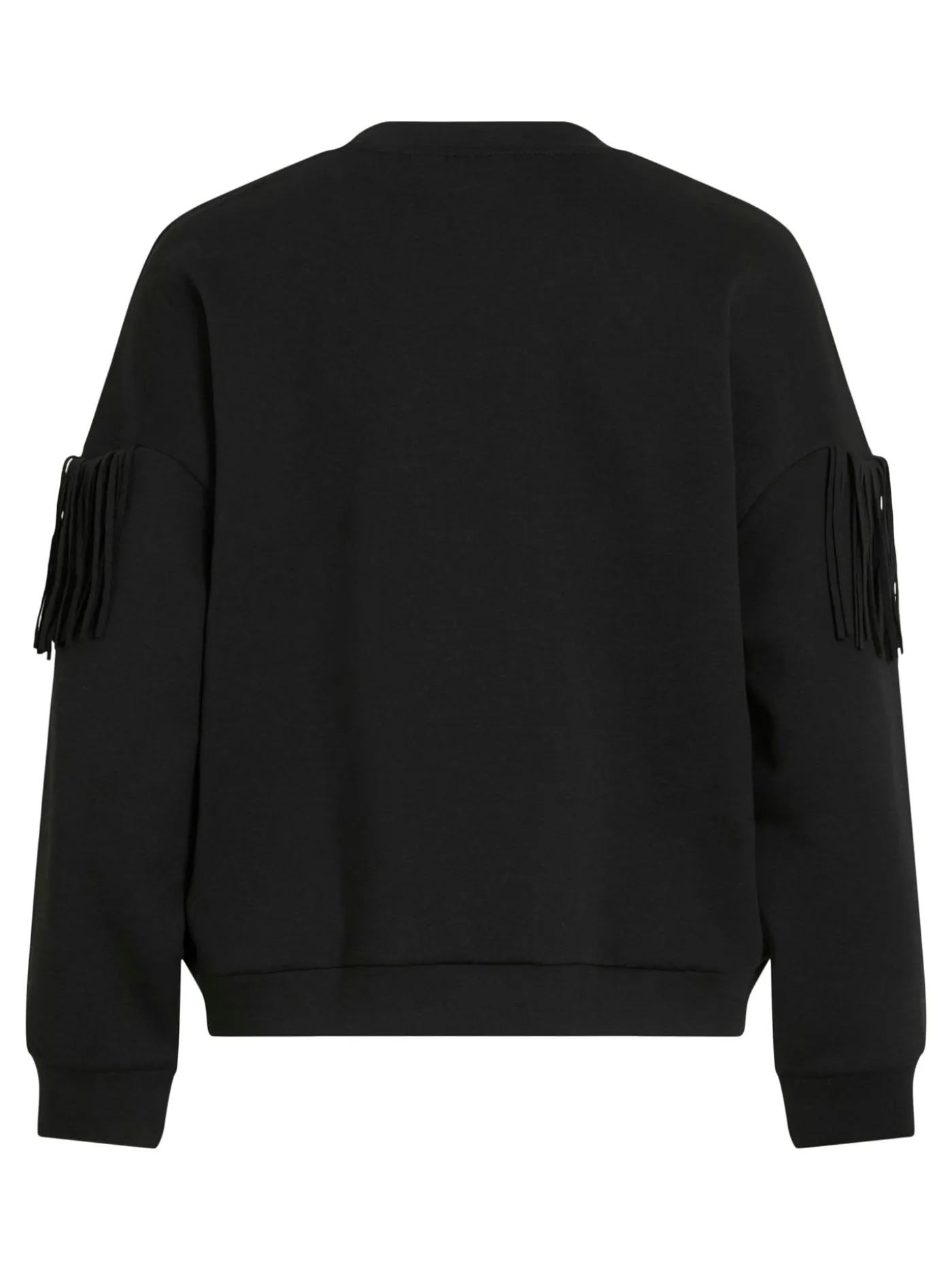 Deze zwarte rechtvallende sweater van Vila voor dames heeft een stoere en moderne uitstraling dankzij de touwtjes over de volledige breedte op borsthoogte. De touwtjes van ongeveer 7 cm lang geven de trui een speels en opvallend detail. Het zachte materiaal en de losse pasvorm zorgen voor optimaal comfort, ideaal voor dagelijks gebruik. Combineer de sweater met jeans of een pantalon voor een casual-chique look.