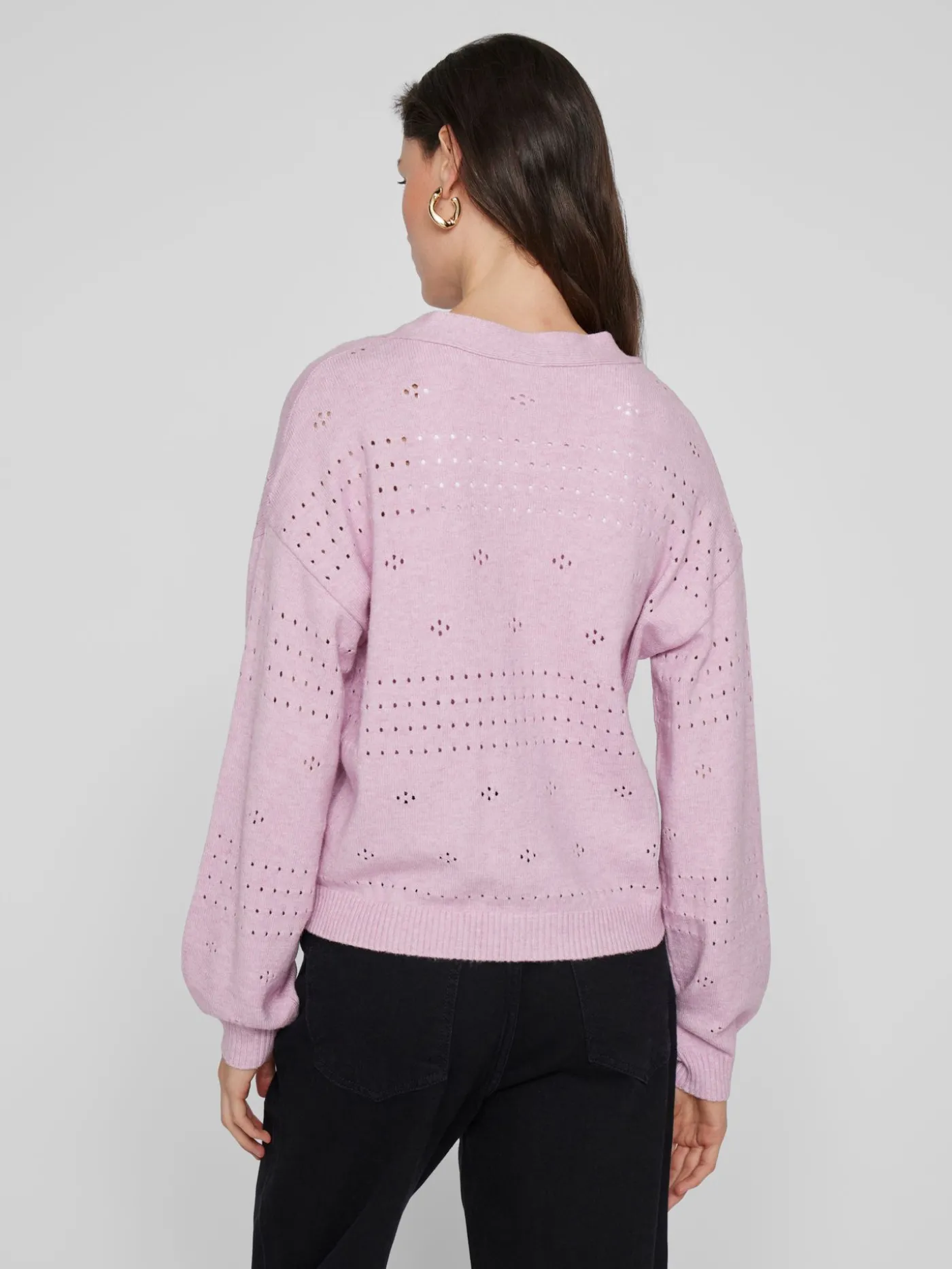 Vest van het merk Vila in een lichtpaarse kleur. Dit Item heeft lange mouwen, V hals, drie knopen waarmee je het vest kan sluiten en er zit een doorzichtig patroon in de stof.