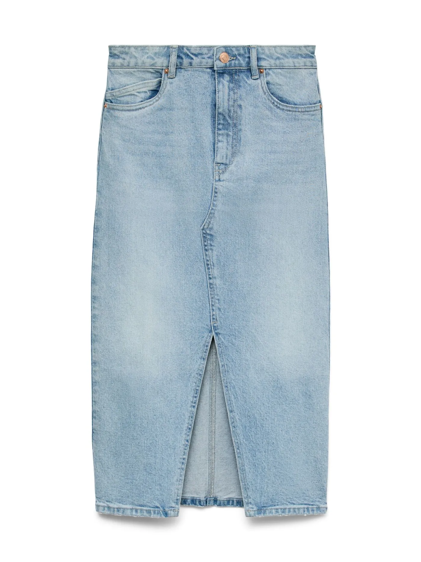 Rok van het merk Vero Moda in een lichtblauwe kleur dit item heeft een knoop -en ritssluiting, twee zakken aan de voorzijde en de rok heeft een 7/8 lengte. leuk te combineren met een top en sneakers.